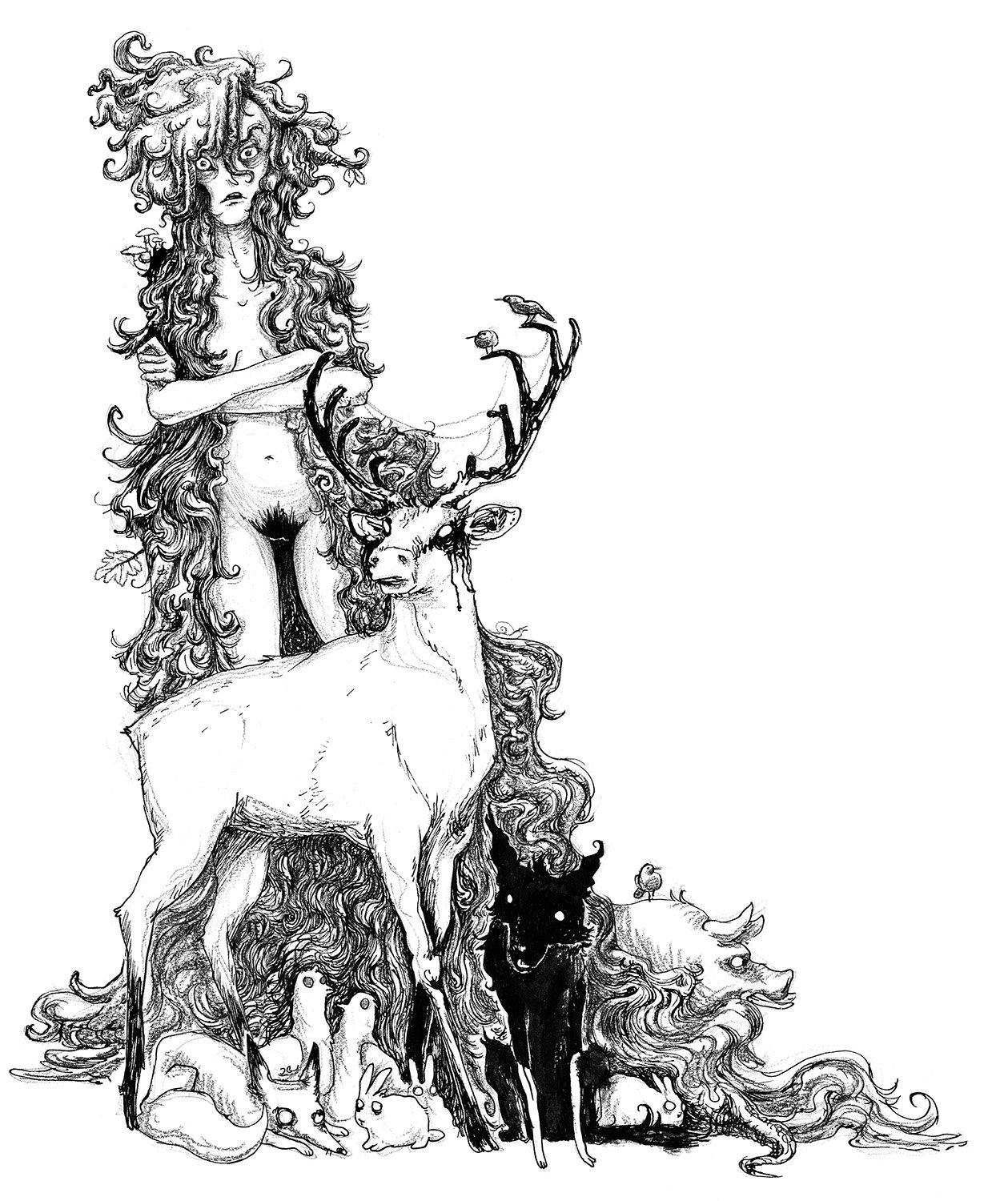 Az odú egy barlangba vezet, ami elég magas ahhoz, hogy még te is kiegyenesedj benne. Az előtted lévő, kacskaringós járatot enyhén foszforeszkáló gombák és szentjánosbogarak világítják meg. Hosszas gyaloglás után az alagút kitágul, és egy roppant méretű csarnokban találod magad. Lábad zsenge és sűrű aljnövényzetet tapos, még egy patak is csordogál valahol. A mennyezetről hatalmas gyökerek ereszkedtek le, ezek egészen a csarnok aljáig érnek. A felülről derengő fényben sokféle erdei állatot fedezel fel, és mindegyikük furcsa, metsző tekintettel mered rád. A földalatti kert közepén összefutó gyökerek egy trónust formálnak. A trónon egy alak ül.